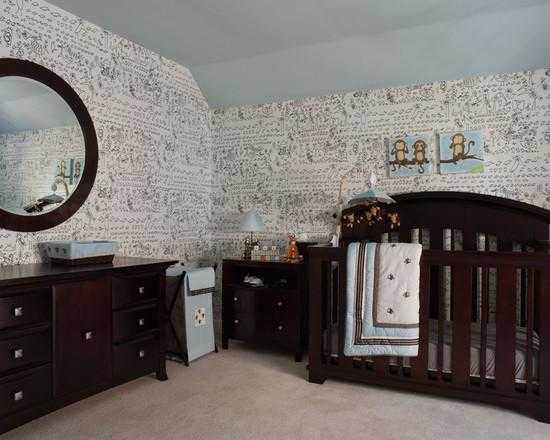 Светлые узорные обои контрастируют со строгой темной мебелью в детской комнате
