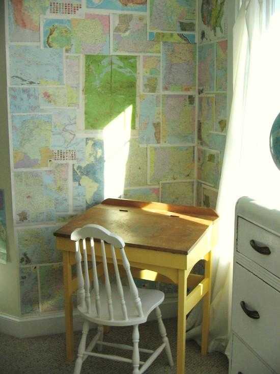 Оригинальное оформление рабочего уголка в детской комнате при помощи географических карт