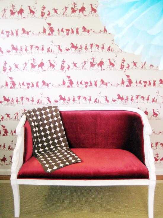 Малиновый цвет рисунка на светлых обоях повторяется в обивке дивана в детской комнате