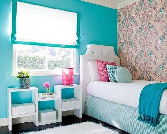 Насыщеный бирюзовый цвет обоев делает интерьер детской комнаты ярким и эффектным