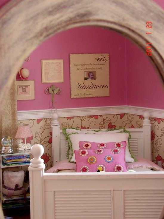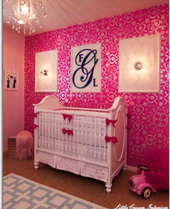 Для одной из стен детской комнаты выбраны обои с орнаментом ярко-розового цвета, тогда как другие стены окрашены нежно-розовым цветом
