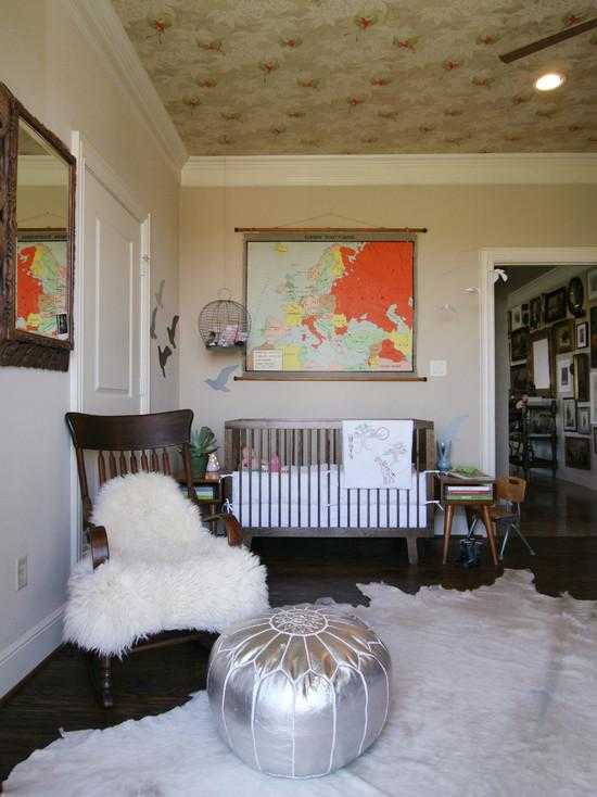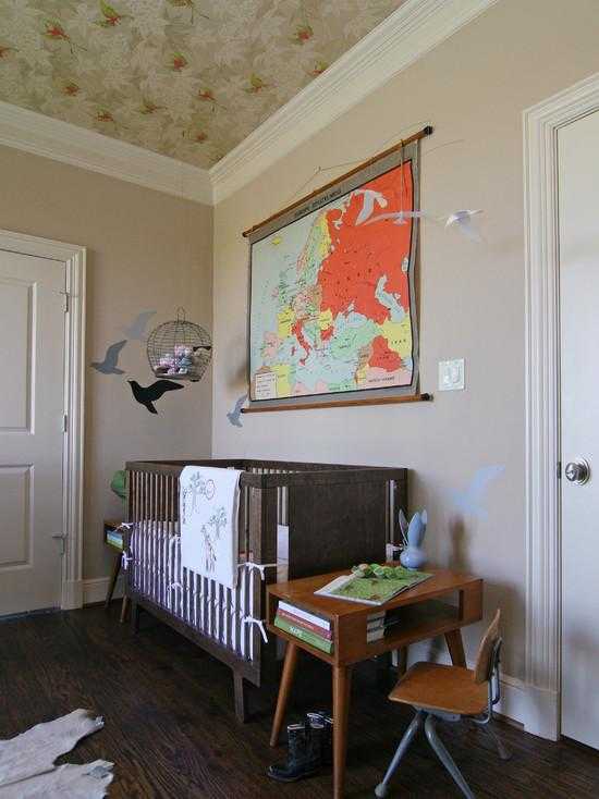 Оклеивание стен и потолка помещения обоями в виде географических карт — оригинальное решение для дизайна детской комнаты