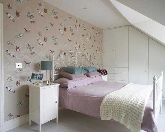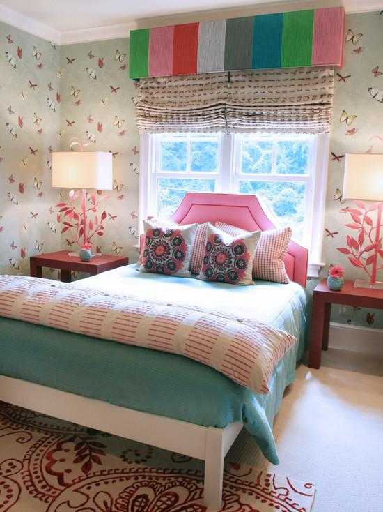 Для оформления интерьера комнаты для девочек прекрасно подходят обои с избражением разноцветных бабочек