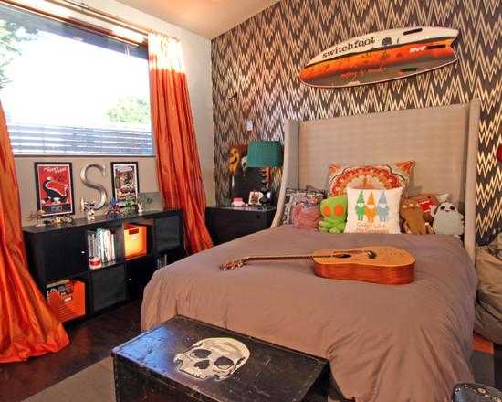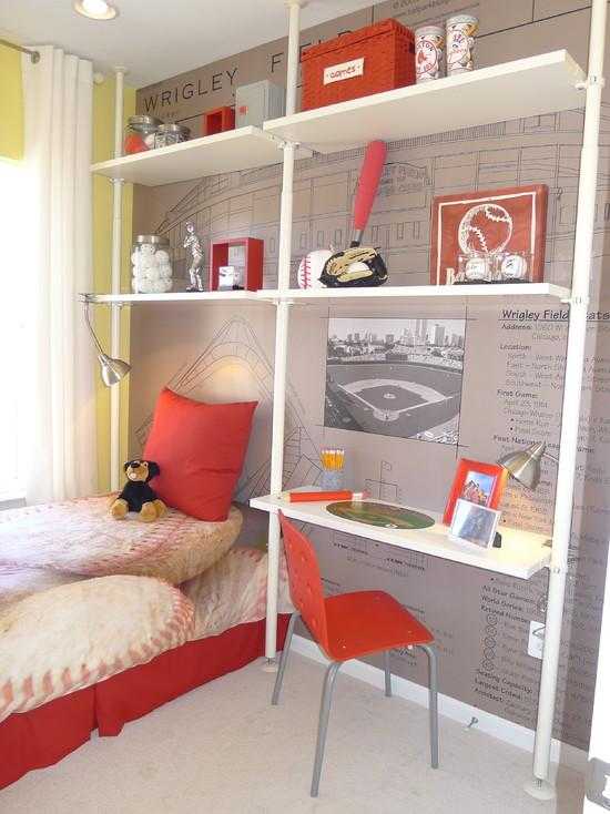Интерьер подростковой комнаты изобилует насыщеными элементами на фоне сдержанной цветовой гаммы обоев