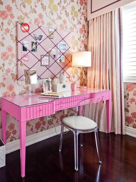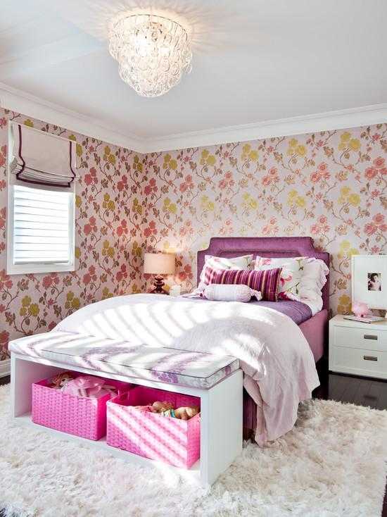 Светлые обои с цветочным рисунком оттенков розового цвета создают в комнате девочки романтичную атмосферу