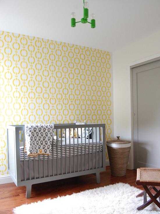 Теплую уютную атмосферу в просторной детской комнате создают обои с желтыми узорами