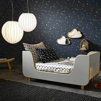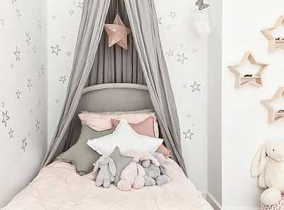 У многих брендов есть обои в редкую точку/квадрат/треугольник/звездочку. Чем не идеальная нейтральная отделка для детской? Они не скучные, потому что не однотонные, но и не мельтешат в глазах. Много подобных вариантов в коллекциях шведских брендов.Например, коллекция Stars от Cole&Son или Young at Home от бельгийцев Decoprint.