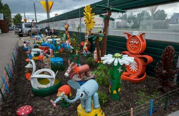 Чтобы на площадке могли появиться сказочные пальмы, используйте бутылки из пластика, а при наличии пеньков, создайте дорожки. Применяя шины, соорудите различные интересные фигуры для сада в виде животных.