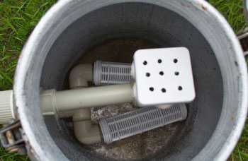 Соединяем все в систему: из бассейна в фильтр грубой очистки, потом в насос, далее в бидон с песком и обратно в бассейн. Перед тем как запускать систему есть смысл собрать со дна выпавший осадок. Сделать это можно при помощи того же насоса, на трубку которого надета обычная щетка от домашнего пылесоса.