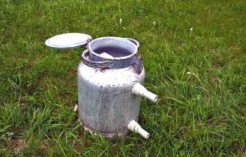 Пока будет идти дезинфекция можно поработать с системой очистки воды для бассейна. Нам потребуется бидон для молока — они продаются в хозяйственных магазинах. Он выбран потому, что может закрываться герметично. Иначе очищенная вода вместе с песком полезли бы изо всех щелей вместо того, чтобы идти в бассейн.