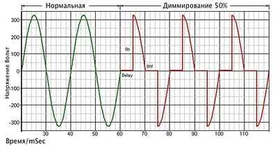 Электрическая сеть поставляет ток, который имеет синусоидальную форму. Чтобы в лампочке изменилась яркость, требуется подача на неё обрезанной синусоиды. Отсечь передний или задний фронт волны можно за счёт тиристоров, установленных в схеме диммеров. Это способствует уменьшению напряжения, подаваемого на светильник, что соответственно приводит к снижению мощности и яркости света.