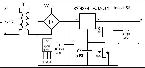 Для регулировки мощности, как и в первых двух схемах, используется переменный резистор (на схеме — R2). От его сопротивления зависит величина опорного напряжения на управляющем электроде КРЕН, от которого, в свою очередь, зависит выходное напряжение. Диапазон регулировки весьма широк — от 12 В (100%) до нескольких десятых.