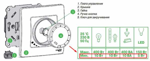 Диммеры отличаются по мощности, поэтому необходимо чтобы она была на 20% выше чем фактический уровень требуемый для ламп, подключенных к регулятору.