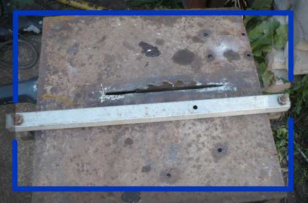 Сверху металлического каркаса крепится рабочий стол из широкой доски или толстой фанеры. По нему будет передвигаться обрабатываемая деталь. Упорный уголок снабжен подвижным креплением для регулировки ширины распила.