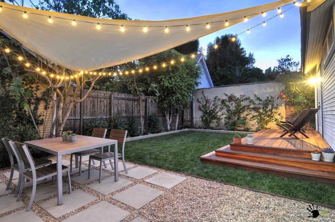 Маленький двор частного дома — ещё не приговор для создания функционального и красивого дизайна. Поскольку размеры участка не всегда позволяют обустроить террасу для отдыха или большую беседку, то вы можете создать небольшой укромный уголок со столом и стульями под деревом или у высоких кустов, дающих тень. Подвесьте на ветки гирлянды, самодельные лампы из бутылок и кашпо с цветами, которые принесут ещё больший уют.