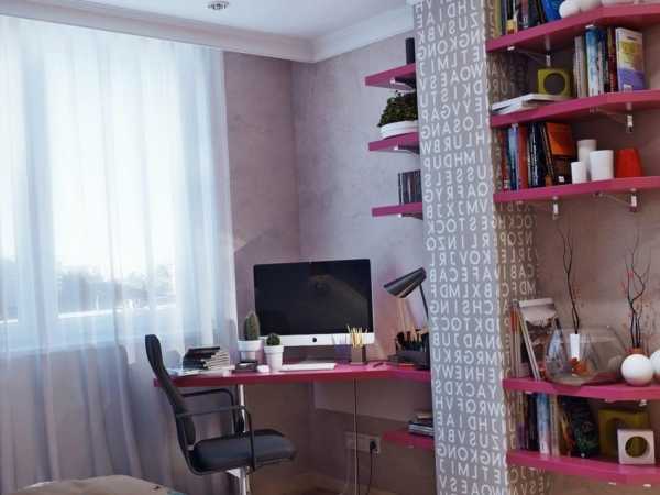 Яркий дизайн подойдет для девочки подростка или школьницы. В этот период жизни ребенок обучается в школе. Следовательно, игрушек становится меньше, а книжек больше. Необходимо правильно спроектировать рабочее пространство, чтобы дочка смогла делать уроки. Стоит выбрать правильное местоположение рабочего стола и хорошее освещение. Полки для книг можно сделать оригинальной формы. Цветовая гамма комнаты может быть любой, главное, чтобы она была светлой.