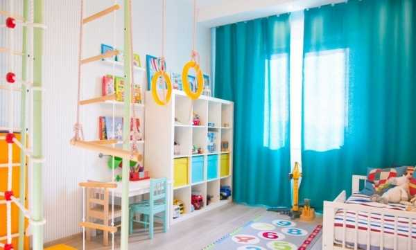 Если маленький любит машинки, посреди игровой зоны установите паровозик или мототрек со многими машинками. Нужна зона для занятий спортом. Например, поставьте лестницу шведскую для сына или двух мальчиков. Пусть детская комната для двух мальчиков или сына будет со спортивным уголком.