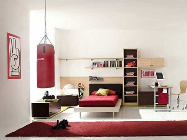 Разрабатывая интерьер, планируя дизайн для мальчика, развивайте его склонности. Если он увлекся карате, боксом, поставьте для него в уголке боксёрскую грушу. Если места мало, сделайте крючок, на который её можно повесить, а потом снять. Дизайн детской комнаты для мальчика пусть будет оформлен в его вкусе.