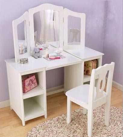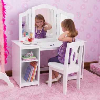 В 5 лет девочка подражает маме — ей понравится, если в интерьере появится туалетный столик с пуфиком, изящная этажерка для туфель, сундучок для детских украшений и зеркало в красивой раме.