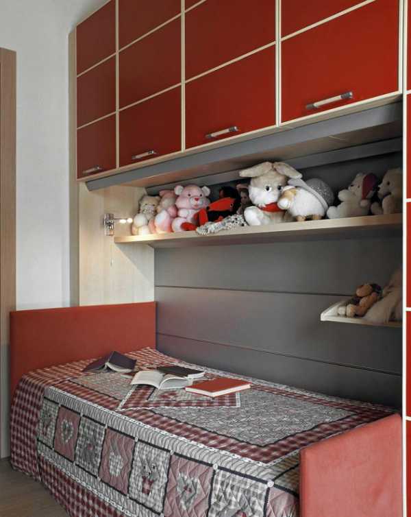 При двухъярусной кровати для третьего ребенка с целью экономии пространства подойдет вариант кровати со шкафчиками