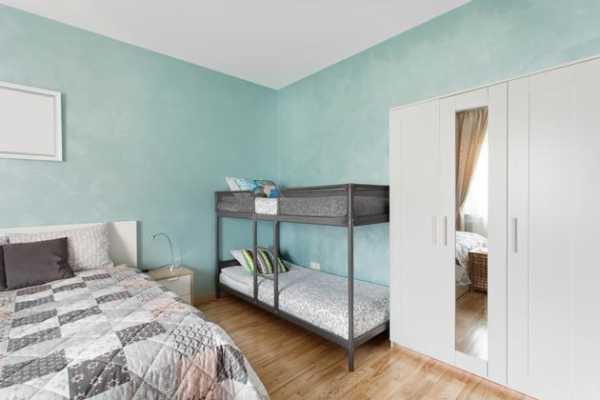 Комната с высокими потолками идеально подойдет для установки трехъярусной кровати. В этом случае особое внимание уделяется безопасности конструкции, немаловажную роль в которой сыграют боковые держатели – ограничители и удобные лестницы.