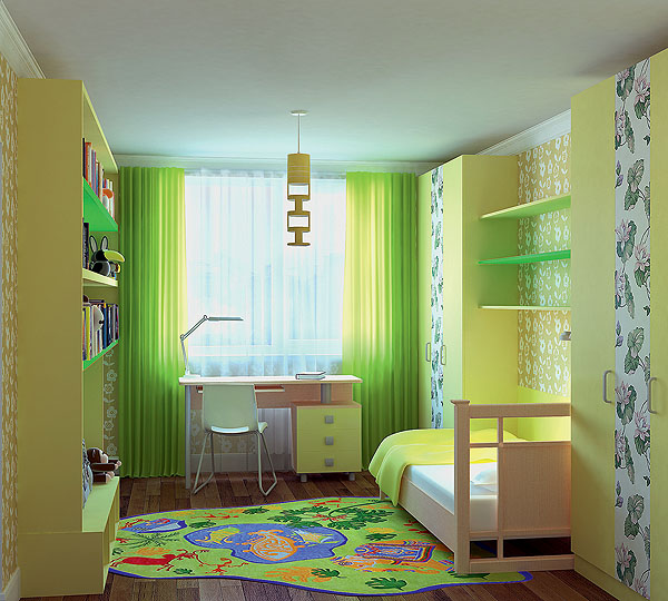 Обычно родители отдают детям меньшее помещение, поскольку мебель и вещи взрослых требуют больше пространства. В детской комнате оформляется место для сна, учебы, устанавливается шкаф. Оставшаяся площадь отводится под игры. Если детей двое, обязательным приобретением становится двухъярусная кровать.