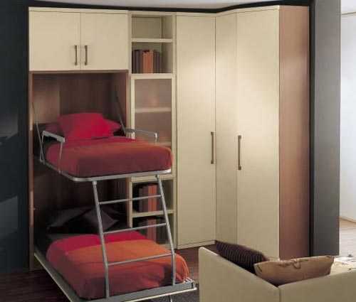 Для очень маленьких комнат, где при установке кроватей остается слишком мало места для игр, можно использовать раскладные кровати, которые при необходимости складываются в шкаф. Конечно, не особо удобно каждый день их убирать, но все же лучше, чем игры на кухне.