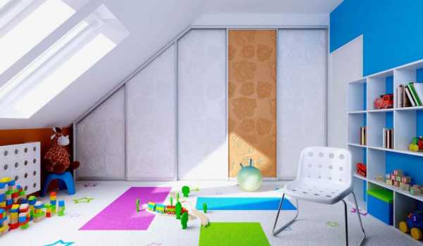 Подойдет для создания гардеробной геометрически сложный участок помещения, куда неудобно ставить другую мебель. Мансарда с потолком, имеющим крутой склон – отличное место, но туда сложно подобрать мебель. Достаточно монтировать боковые части и двери, которые оформляются как продолжение стен. Некоторые предпочитают завесить встроенный шкаф шторками. В случае надобности их можно прикрыть, в остальное время – собрать в сторонке для удобного пользования детьми. Пол служит днищем гардеробной, что существенно снижает затраты. К тому же он служит безопасной основой, куда будет становиться ребенок.