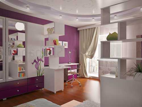 Перед выбором отделочных материалов и покупкой мебели, максимальное внимание стоит уделить зонированию пространства. Ведь в своей комнате ребенок не только отдыхает, но и занимается, встречается с подругами и друзьями, уделяет время своему хобби. Поэтому в интерьере следует, хотя бы зрительно, разделить рабочую зону, зону отдыха, зону хранения одежды и вещей.