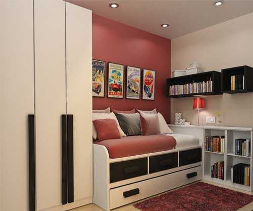 Если есть хотя бы минимальная возможность, отделите зону отдыха от прочей части комнаты. В качестве перегородки можно использовать стационарные стеллажи, шкафы для хранения одежды или легкие переносные ширмы, раздвигающиеся по мере необходимости. Для совсем маленького помещения можно приобрести кровать-трансформер, которую в дневное время легко превратить в книжный шкаф или вертикальную панель с откидывающимся столом. Такая модель, несомненно, придется по вкусу тинейджерам, ценящим неординарные вещи.