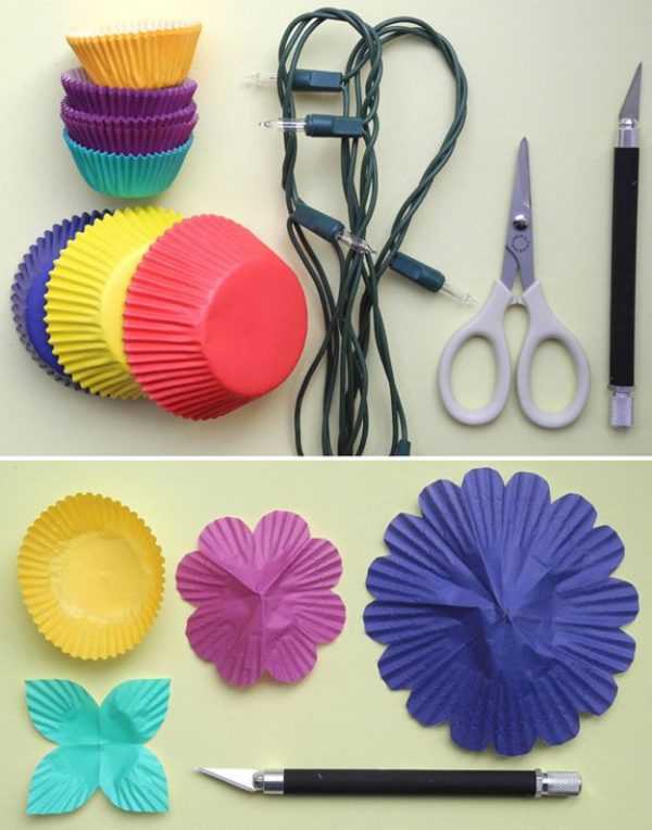 Понадобится: новогодняя гирлянда, бумажные формочки под кексы разного размера, ножницы, ножик.