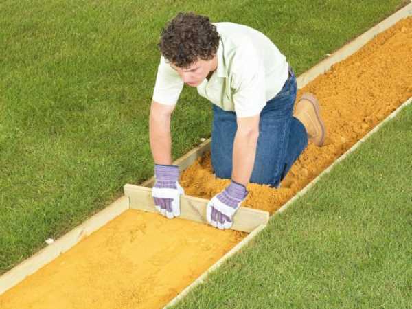 Первое, что нужно сделать – это вырыть котлован. Работа эта не столько сложная, сколько трудоемкая. Для садовой дорожки или тропинки потребуется выемка глубиной от 2 см с ровными боковыми краями – они будут служить границами. Они отсыпаются песком и укрепляются досками.