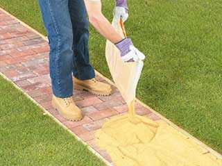 По завершение укладки для заполнения швов по дорожке рассыпается песок и разметается по ней метлой. После чего пролейте дорожку из шланга с распылителем.