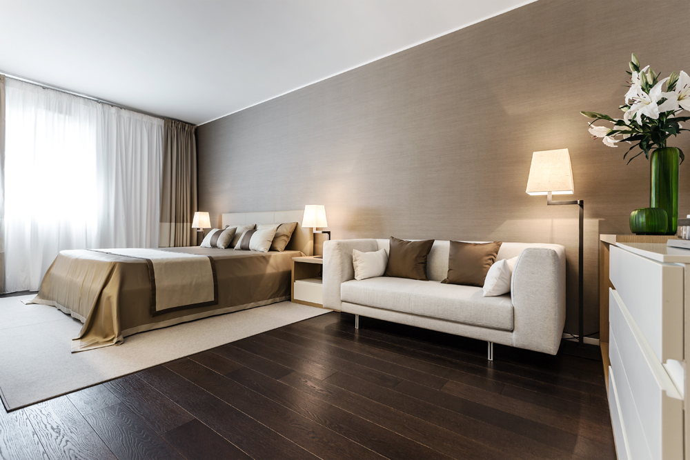 Напольное покрытие также имеет влияние на общее впечатление от комнаты. В гостиной целесообразно будет положить паркет, ламинат, линолеум с рисунком перпендикулярным или диагональным продолговатой стороне, таким образом, контраст между длиной стен будет не так заметен. Укладывать ламинат с рисунком параллельно длинной стене в целом можно, но в таком случае стоит позаботиться о том, чтобы напольное покрытие имело светлый оттенок.