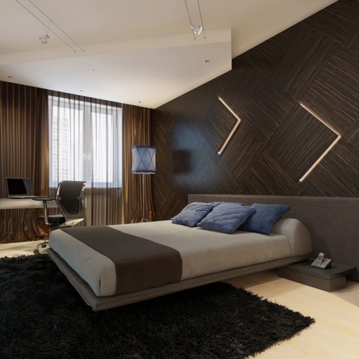 Исходя из тех же соображений, воздержитесь от ковров вытянутой формы вдоль большей стены. Остановитесь на небольшом варианте овального или оригинального несимметричного вида. Он может быть украшен полоской, расположенной параллельно небольшим сторонам.