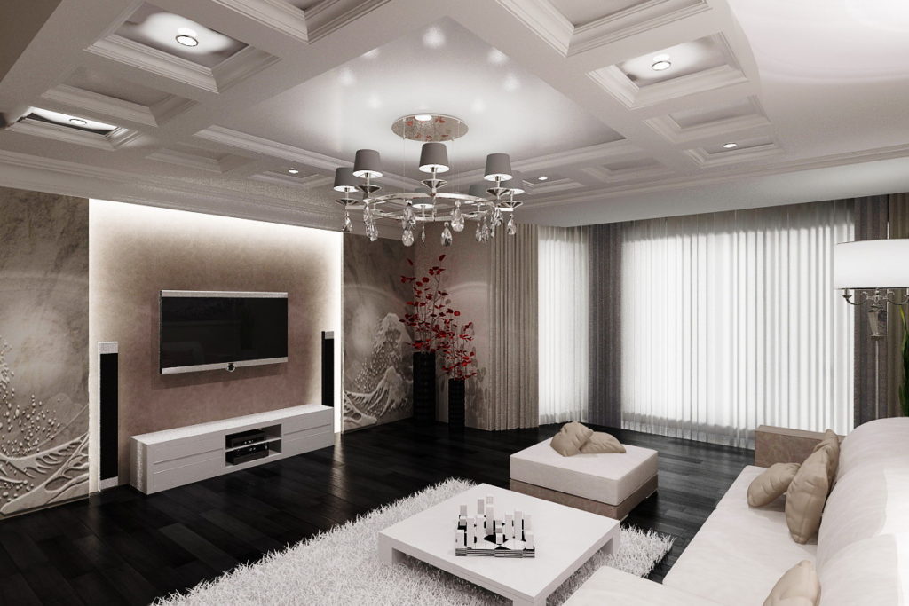 Действенный способ скорректировать форму узкой гостиной цветом – покрыть продолговатые стены светлым оттенком, а короткие – насыщенным глубоким. Пара черного и белого подойдет сюда как нельзя кстати. К тому же, это сочетание способно сделать оформление интересным и выразительным, а также оно отлично впишется в любое современное дизайнерское направление.