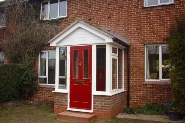 Это наиболее экономичный тип устройства крыльца. Он применяется в стиле минимализма и служит долгие годы хозяевам в качестве укрытия. Защищенное таким способом крыльцо смотрится монолитным и целым изделием. Его устраивают в домах из кирпича и камня, украшением могут служить стеклянные окна, которые можно выполнить арочной формы. Для устройства кровли используют металлическую черепицу насыщенных цветов. Выполнение стен пристройки крыльца из бетона требует сооружения массивного фундамента.