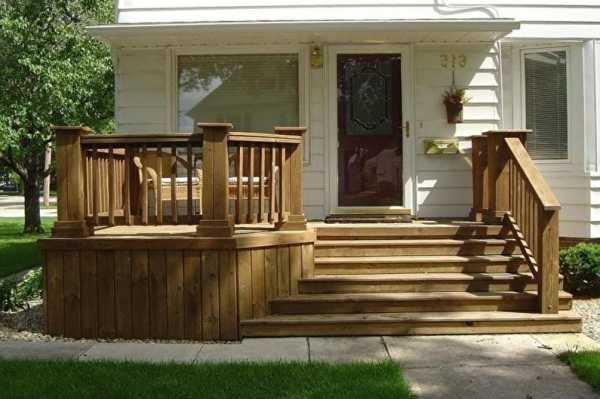 Самым востребованным вариантом остается установка деревянного настила на крыльцо. В большинстве случаев такие конструкции изготавливают из сосновой древесины, как наиболее недорогого и популярного натурального сырья. Если правильно герметично установить крыльцо, лакировать и окрасить, то оно будет привлекательно смотреться долгие годы.