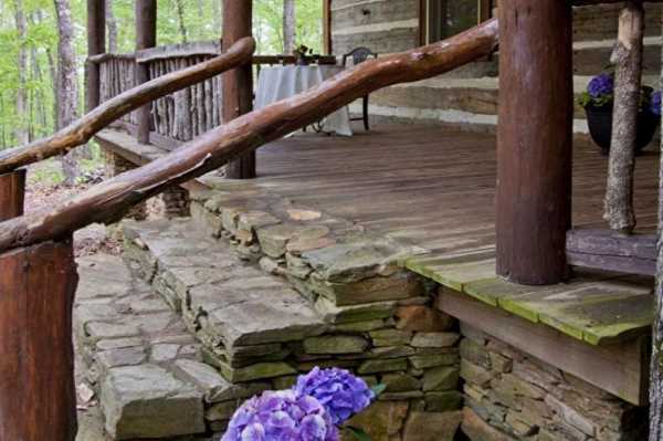Натуральный камень сочетается с деревом, коваными изделиями, брусом. Их используют для оформления крыльца. При этом стараются сохранить натуральные текстуры материала. Ступени можно выложить из дикаря, балясины и опорные столбы сделать из толстого бруса.