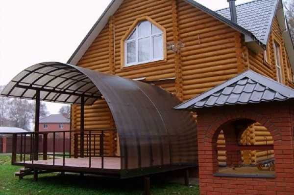 Поликарбонат относится к полупрозрачным материалам, он легок и удобен в работе. Его крепят к каркасу, выполненному из металла. Кованая конструкция может быть оформлена, как отдельная деталь фасада или быть просто неприметным основанием для листов. Такая полупрозрачность материала часто используется для затенения совмещенных с крыльцом беседок, террас и веранд.