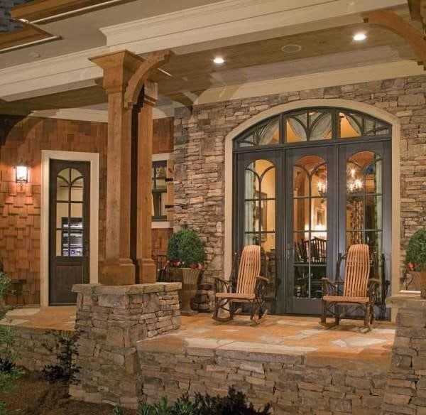 Если постройка каменная, то вы можете вписать в общую конструкцию крыльцо с колоннами. Натуральный камень можно сочетать с монументальными элементами. Такая композиция будет смотреться гармонично.