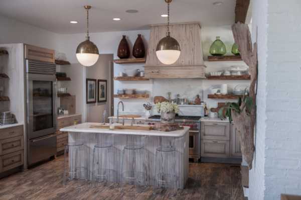 Деревенский стиль напоминает о летних каникулах, отпусках и дачах. В нем много натуральных материалов — применяется мебель из массива, плитка под камень, дощатый пол. Духовой шкаф может быть стилизован в духе настоящей дровяной печи, а вытяжку стоит закрыть имитацией дымохода.