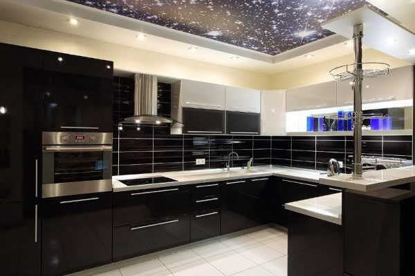Оптимальный вариант оформления потолка в маленькой кухне — светлая натяжная пленка или же простое окрашивание. Выровнять поверхность, а также избежать микротрещин на штукатурке поможет стекловолокно.