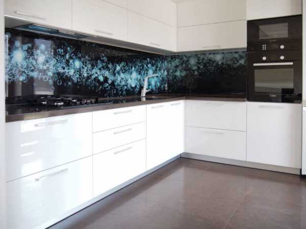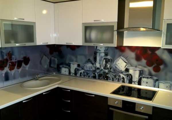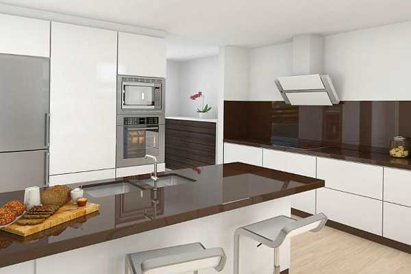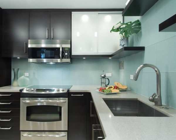 Зону над мойкой, плитой и столешницей желательно защитить керамическим покрытием (плиткой, гладким искусственным камнем) или закаленным тонированным стеклом.