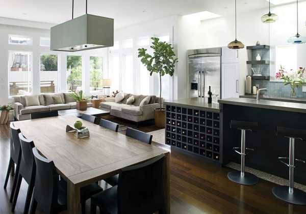 Если стена между кухней и гостиной не несущая, ее стоит убрать. Таким образом, у вас получится очень удобная зона для готовки. При этом важно установить мощную вытяжку, чтобы запах и пар от плиты не распространялись по всему дому.