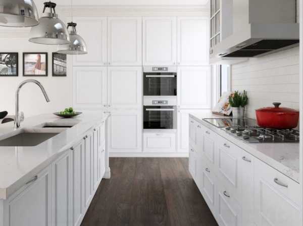 Полностью белоснежная кухня всегда будет выглядеть чистой и аккуратной. Чтобы сделать ее по-домашнему уютной, можно добавить деревянных текстур, а серые дополнения помогут облегчить процесс уборки.