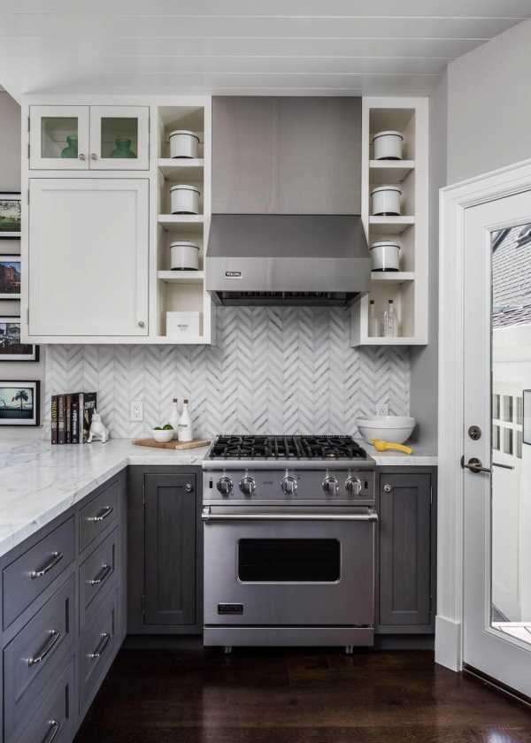 Нейтральный оттенок камней и стали — идеальное решение для сдержанного дизайна маленькой кухни. К нему легко подобрать любую современную технику. При желании серый цвет удачно разбавляется более насыщенными вкраплениями из радужной палитры.