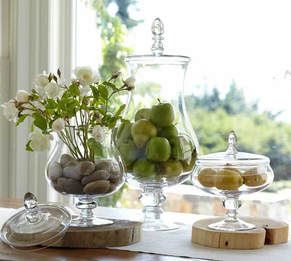 Прозрачный и блестящий декор – выбор многих современных дизайнеров. Это могут быть небольшие вазочки, рамки фото и картин, кухонные аксессуары, подставки под горячее и пр.