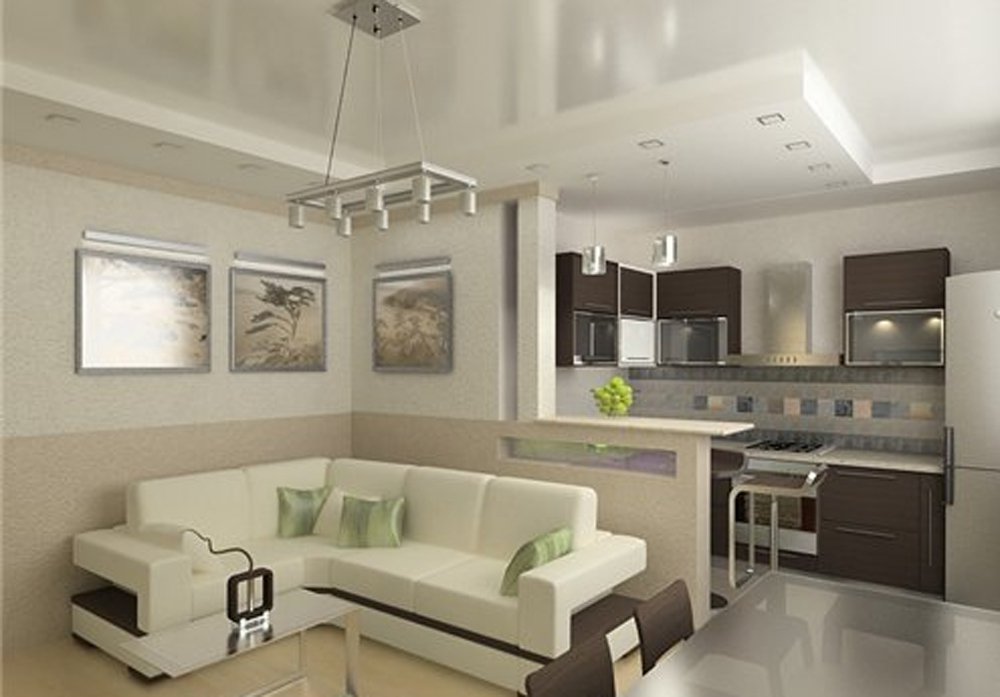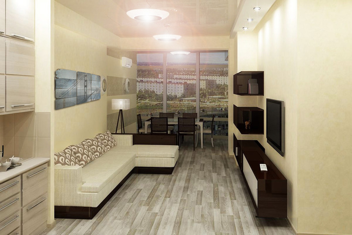 Помните: в такой малогабаритной комнате стоит с умом продумать каждый сантиметр пространства. Поэтому ремонтировать гостиную и кухню без использования эскизов, чертежей и макетов не рекомендуется.