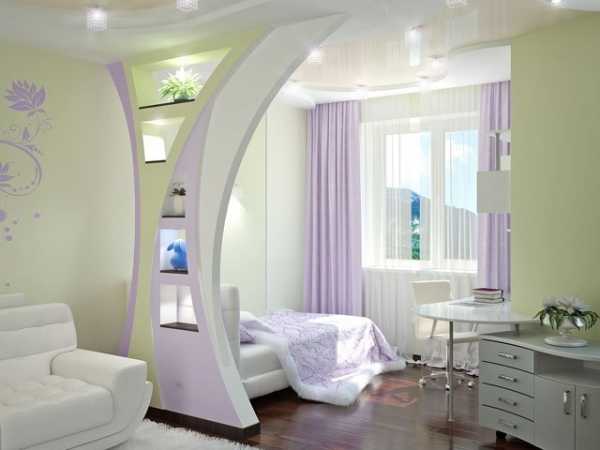 Натяжные и подвесные конструкции потолков в сочетании с осветительными приборами и цветовыми акцентами в отделке помещения, позволят разделить зоны друг от друга.